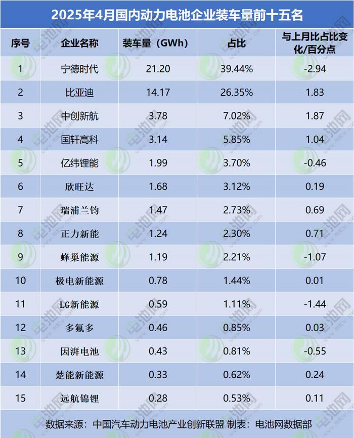 从国内动力电池TOP15排名来看,与3月份相比,4月,第一梯队公司宁德时代与比亚迪地位稳固,二三梯队企业仍竞争激烈。欣旺达由第7名升至第6名;瑞浦兰钧由第9名升至第7名;正力新能由第10名升至第8名;蜂巢能源由第6降至第9名;极电新能源由11名升至第10名;LG新能源由第8名掉出前十名,降至第11名;因湃电池与多氟多排名互换,多氟多排第12名,因湃电池排第13名;楚能新能源升至第14名,远航锦锂排名15不变,耀宁新能源掉出TOP15。