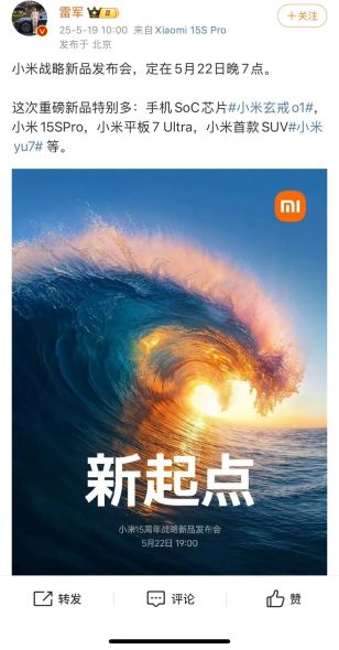 按照雷军在个人微博发布的信息来看,将于5月22日举办的小米战略新品发布会,即将发布的重磅新品包括手机SoC芯片“小米玄戒o1”、小米15SPro、小米平板7 Ultra、小米首款SUV“YU7”等。