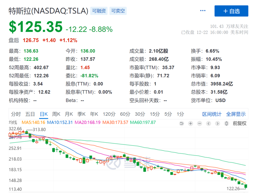 而在一年前,2021年的特斯拉似乎所向披靡,在全球电动汽车市场乐观情绪高涨的情况下,其股价接近历史新高。而现在,投资者正努力寻找底部。