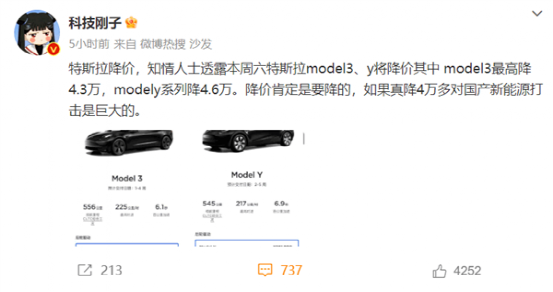 有博主指出,特斯拉将会在本周末对在华出售车型进行价格调整,主要以Model 3/Model Y两款车型为主,预计Model 3 降价4.3万、Model Y降价4.6万元。