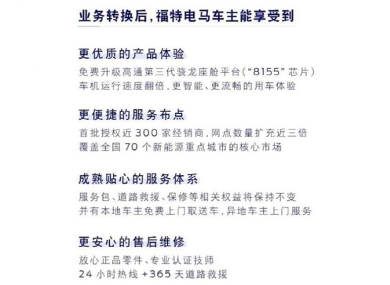 而在长安福特接手电马之后,电马车主马上得到了“更好”的对待。长安福特提出将为所有福特电马的老车主免费升级高通第三代骁龙8155芯片,以提升整车系统的响应速度和智能化水平。除此之外,还有更多的售后网点以及服务体系。