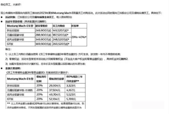同时,近日还出现电马降价清库存的消息。原价至少25万的福特电马,促销后不到15万就能买到,降幅超过10万。虽然目前该活动只针对福特内部员工,但降价幅度也颇为惊人。此番政策一出,虽然有机会在短期内缓解电马的销量困局,但也让消费者产生了更浓厚的观望心态。