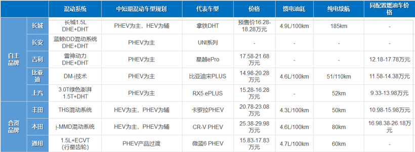 主流车企混动产品布局情况,图表来源:普来智行研究院