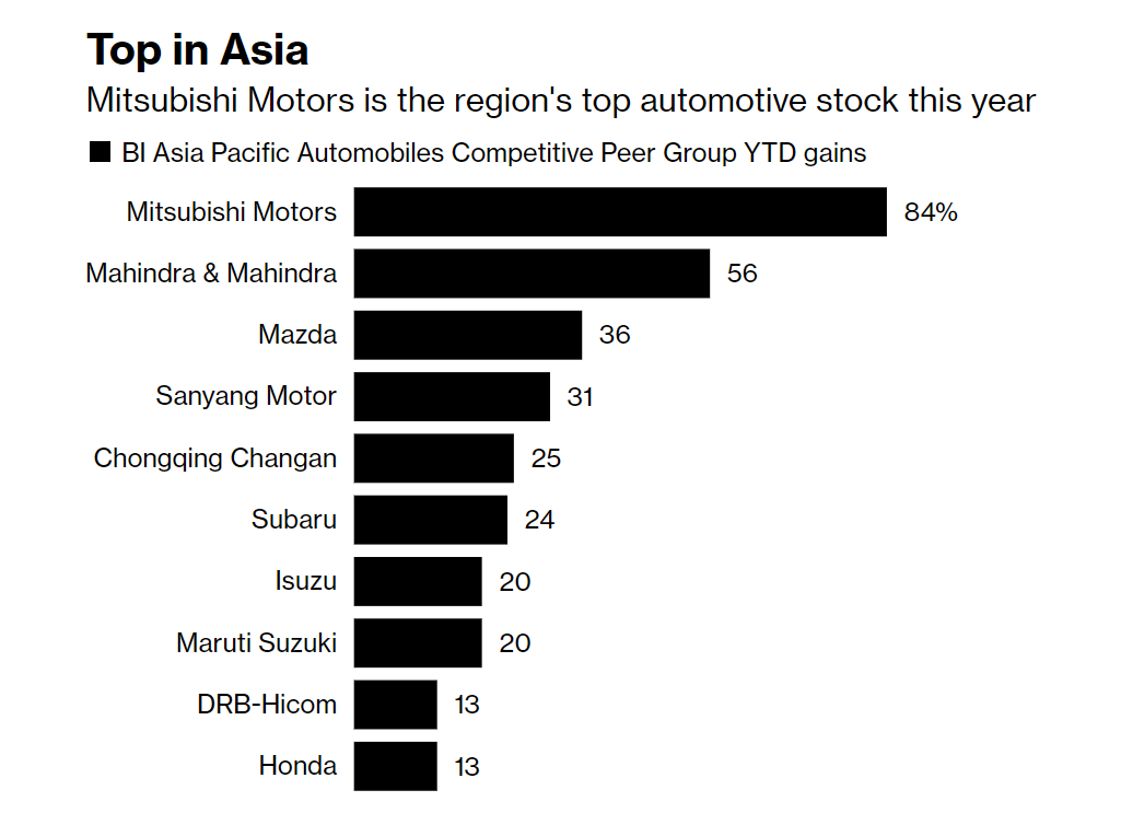 得益于日元疲软,今年亚洲表现最好的10支汽车股中,有一半来自日本,不过三菱汽车的股价涨幅是其他竞争对手的两倍以上。马自达和斯巴鲁的股价上涨了20%以上,而丰田的股价则有所下降。