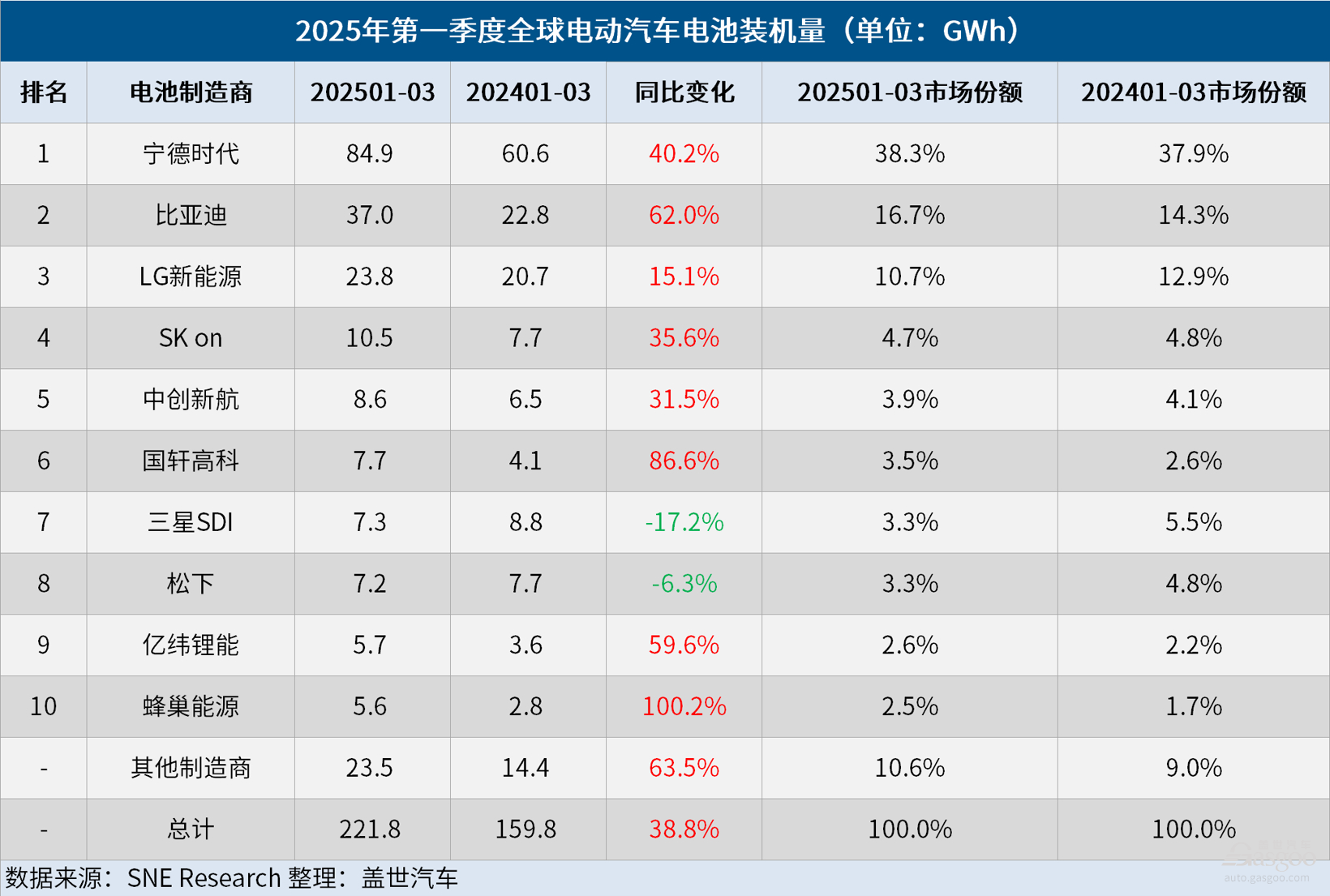 日前,韩国市场研究机构SNE Research公布的数据显示,2025年第一季度,全球电动汽车(包括纯电动汽车、插电式混合动力汽车、混合动力汽车)电池装机量为221.8 GWh,较去年同期的159.8 GWh增长38.8%。