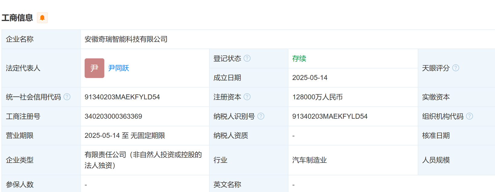 近日,天眼查App信息显示,安徽奇瑞智能科技有限公司正式成立,法定代表人为奇瑞汽车股份有限公司董事长尹同跃,注册资本高达12.8亿元人民币。这一举措标志着奇瑞集团在智能科技领域的布局进一步深化,为其在新能源及智能出行领域的持续创新提供了强有力的支撑。