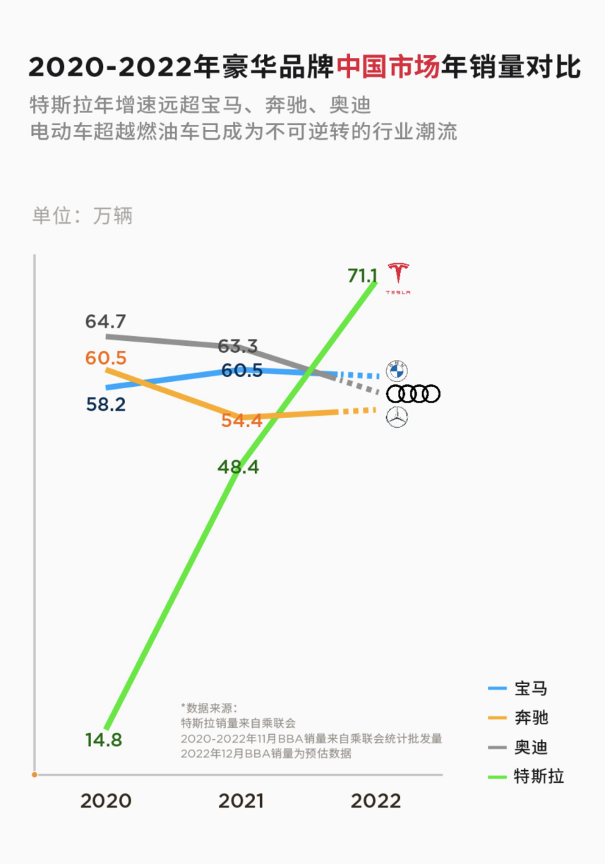 中国市场,上海超级工厂71万辆的交付量,远超乘联会统计的2021年宝马、奔驰、奥迪品牌在华批发数据。根据乘联会公布的2022年前11月批发量显示,如无意外,在开启交付国产车型的三年之际,特斯拉仅凭Model 3和Model Y两款车型,便能超越宝马、奔驰、奥迪,夺得中国市场豪华品牌交付冠军。