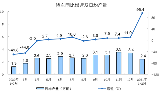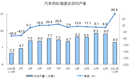 从产品产量来看,1-2月,612种产品中有565种产品同比增长。汽车产量增速名列前茅,共生产385.5万辆,增长89.9%。其中轿车143.4万辆,增长95.4%;SUV 136.3万辆,增长81.3%;新能源汽车31.7万辆,增长395.3%。