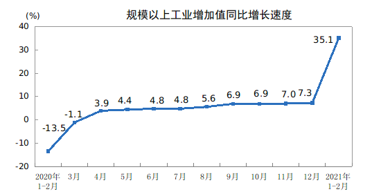 昨日,国家统计局发布的最新工业生产数据显示,1-2月,规模以上工业增加值同比实际增长35.1 %,比2019年1-2月增长16.9%,两年平均增长8.1%。从环比看,2月规模以上工业增加值比上月增长0.69%。
