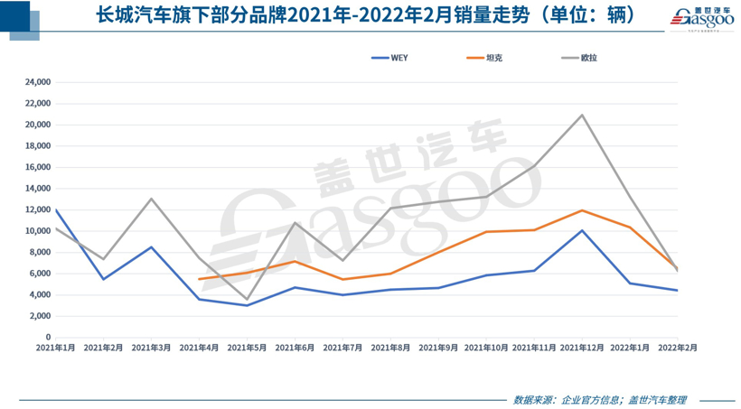 对长城汽车来说,WEY、坦克、欧拉几大新品牌的表现也相对可观。排除今年前两月由于春节等因素所产生的环比下滑情况,这几个品牌此前均呈现了良好的增长势头。例如欧拉品牌,去年12月其月销甚至飙到2万辆以上;坦克品牌销量也几乎是一路上升,去年12月月销接近1.2万辆,今年2月其销量较去年同期增长了近1倍;魏牌的表现相对平稳,去年最高月销达到1.2万辆。