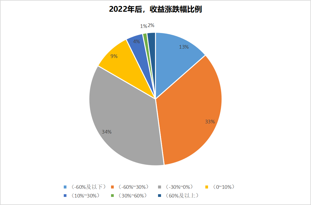 据普来智行近期发起并收到的1800余份相关主题调研反馈发现,2022年后到现在,有八成参与者收益率为负数,甚至有近五成跌幅超过30%,这里面进入股市五年以上的老股民比比皆是。相较而言,何玉是幸运的,毕竟本金还在。