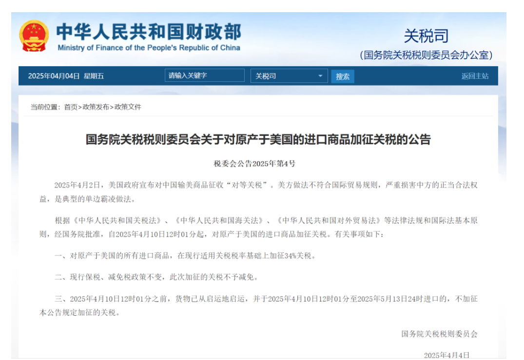 面对美国的挑衅,中国迅速作出反应。4月4日,中国发布强有力的反制措施,对原产于美国的所有进口商品加征34%关税。