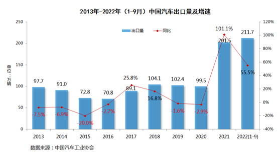 不得不承认,近年来我国汽车出口增长势头强劲,尤其是新能源汽车出口已成为一大亮点,国产新能源汽车在海外市场的渗透率快速提升。2021年,中国汽车出口首次突破200万辆;2022年8月我国汽车出口量首次跃居全球第二,创下历史新高。中国汽车工业协会公布的最新数据显示,今年前9月,汽车企业出口汽车211.7万辆,同比增长55.5%,已超过去年全年。