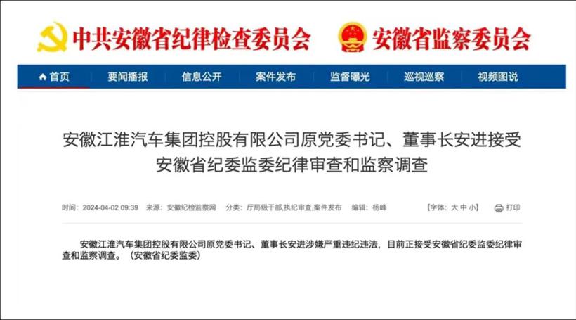 4月2日,据安徽省纪委监委消息,安徽江淮汽车集团控股有限公司原党委书记、董事长安进涉嫌严重违纪违法,目前正接受安徽省纪委监委纪律审查和监察调查。